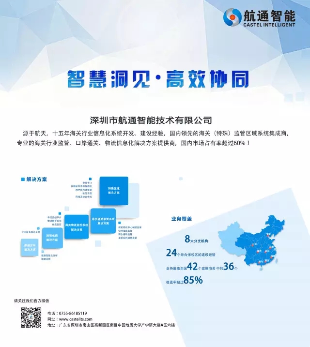 航通智能是國(guó)家級(jí)高新技術(shù)企業(yè)和雙軟認(rèn)證企業(yè),并獲得CMMI3資質(zhì)認(rèn)證。歷程十五載,航通智能已于海關(guān)行業(yè)監(jiān)管、口岸通關(guān)、保稅物流、加工貿(mào)易、物流信息化應(yīng)用集成領(lǐng)域在全國(guó)建設(shè)了數(shù)百個(gè)特殊監(jiān)管區(qū)與和監(jiān)管場(chǎng)所信息化系統(tǒng)。其中涉及云卡口、大數(shù)據(jù)風(fēng)險(xiǎn)分析、北斗/GPS監(jiān)控應(yīng)用、RFID射頻識(shí)別、移動(dòng)智能終端等應(yīng)用技術(shù)。業(yè)務(wù)覆蓋全國(guó)42個(gè)直屬海關(guān)中的36個(gè),關(guān)區(qū)覆蓋率超過85%,核心業(yè)務(wù)市場(chǎng)占有突破60%。